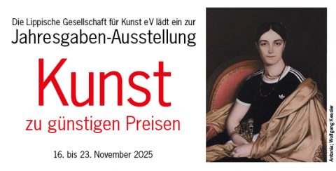 16. November–23. NovemberDie Lippische Gesellschaft für Kunst lädt Mitglieder und Kaufinteressenten ins Foyer des Detmolder Sommertheaters ein, sich einen Überblick über die jeweiligen Jahresgaben zu verschaffen und die Chance zum Erwerb eines Bildes zu bezahlbarem Preis zu nutzen. Die Ausstellung ist montags...