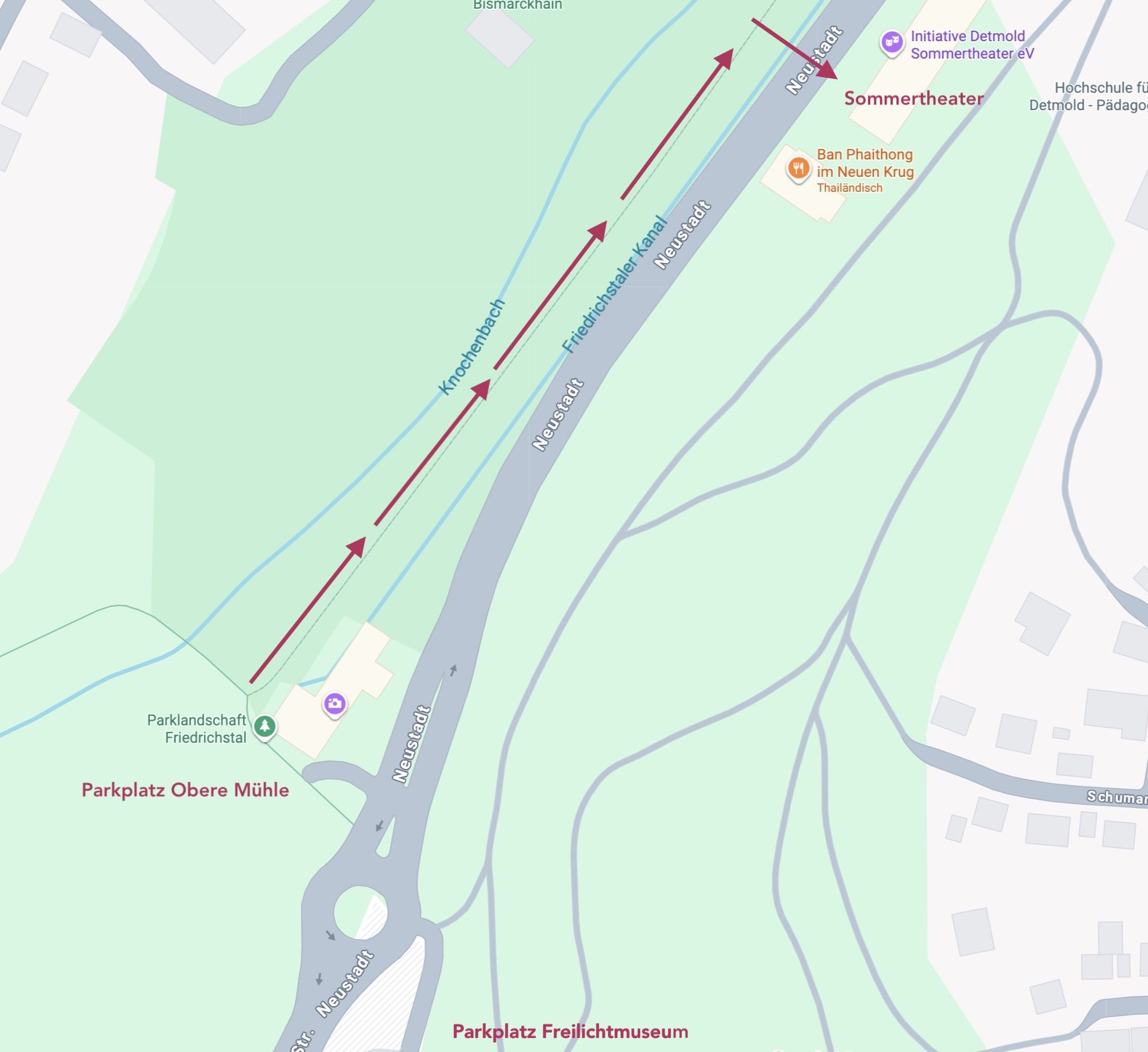 Die Parkplätze an der Oberen Mühle und am Freilichtmuseum sind weiterhin zugänglich und aus Fahrtrichtung Berlebeck/Heiligenkirchen/Hiddesen erreichbar. Von dort aus gelangen Sie auf dem Rad-/Fußweg entlang des Friedrichstaler Kanals über die dem Sommertheater gegenüberliegende Brücke zu uns. Der Gehweg an der Paderborner Straße kann nicht genutzt werden.