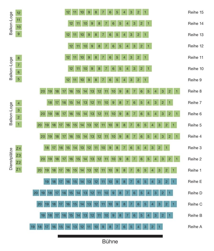 Die Anordnung der 240 fest installierten Sitze (Reihen 1 bis 15), deren Anzahl durch variable Bestuhlung (Reihen 1a bis 5a) auf rund 340 Plätze erhöht werden können sowie die Galerie bieten eine optimale Sicht zur Bühne bei einer hervorragenden Akustik.